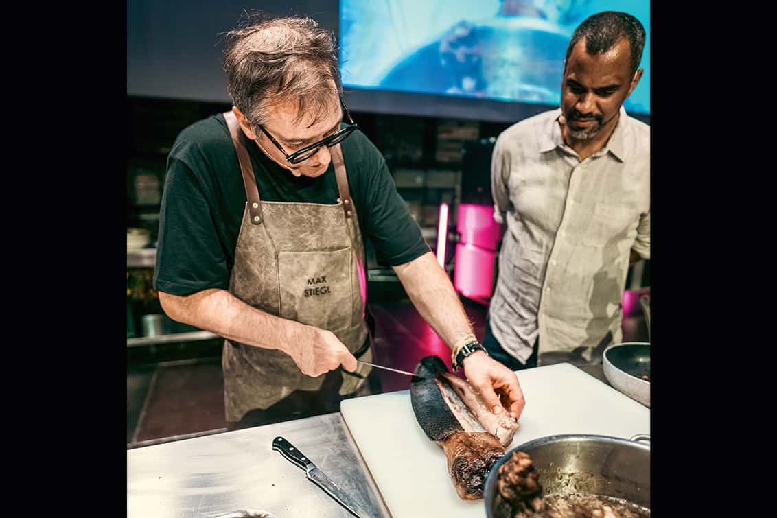 Max Stiegl betritt sie mit einem schelmischen Grinser. Und wer Max Stiegl kennt, weiß: Da ist irgendwas im Busch. Denn der Vier-Hauben-Koch aus dem burgenländischen Purbach liebt es, am besten uns alle gleichzeitig vor den Kopf zu stoßen. Im besten Sinne, versteht sich. Seine regionalverankerte, selbstsichere und dabei genauso virtuose Nose-to-Tail-Küche zelebriert das gesamte Tier als Edelteil. Und zeigt uns immer wieder auf: Nachhaltiger Fleischkonsum ist möglich, wenn man ein Tier nicht auf sein Filet reduziert. Wobei: Mit dem Tier fängt es ja schon an. Muss es immer Rind sein? Oder Schwein?