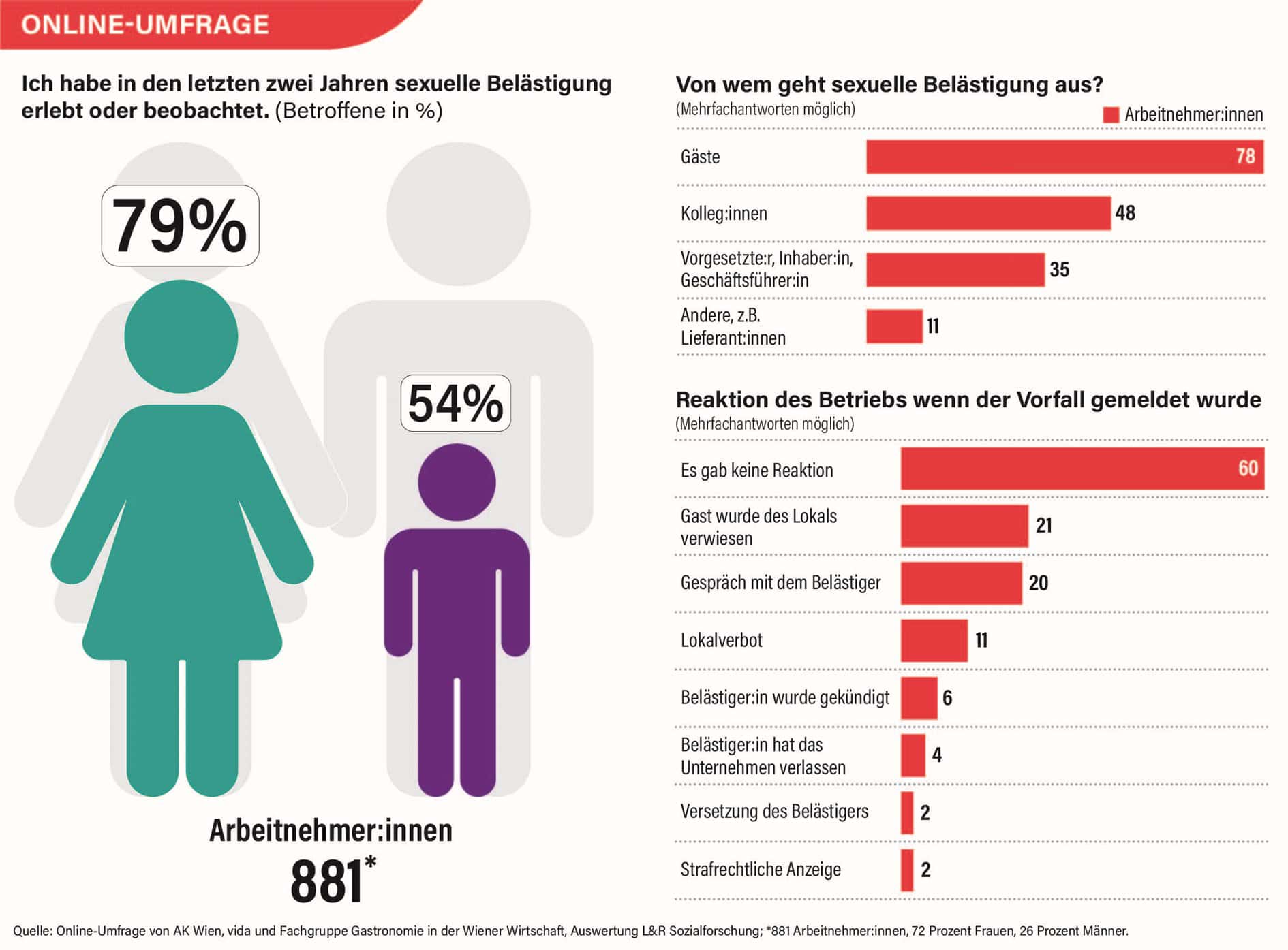 Die AK fordert den Gesetzgeber dazu auf, Unternehmen mehr in die Pflicht zu nehmen. «Bei fehlendem Präventionskonzept sollen es mindestens 5000 Euro Schadenersatz sein», sagt Ludwig Dvorák, AK Bereichsleiter Rechtsschutz. Außerdem appelliert er an die Betriebe, den von AK, Gewerkschaft vida und Wirtschaftskammer Wien ausgearbeiteten Leitfaden «Schutzkonzept gegen sexuelle Belästigung in der Wiener Gastronomie» anzuwenden.